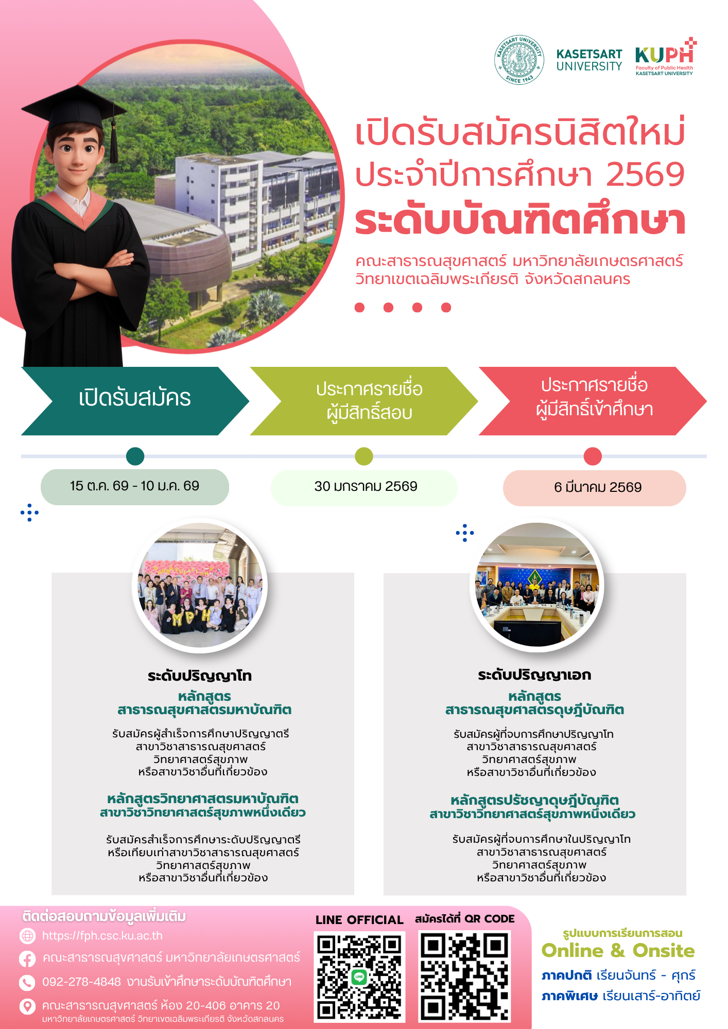 • คณะสาธารณสุขศาสตร์ ขอแสดงความยินดี รศ.ดร.อนุศักดิ์ เกิดสิน เนื่องในโอกาสได้รับทุน โครงการส่งเสริมและพัฒนาศักยภาพกำลังคนและการสร้างสรรค์งานวิจัยขั้นสูง เพื่อการพลิกโฉมมหาวิทยาลัยเกษตรศาสตร์ (KU Reinventing) ปีงบประมาณ พ.ศ. 2569
